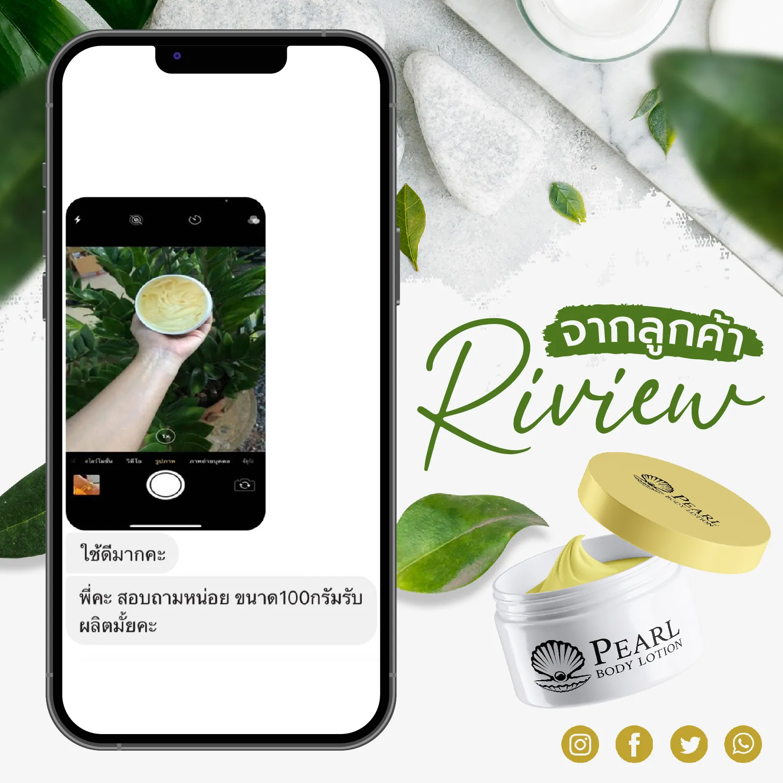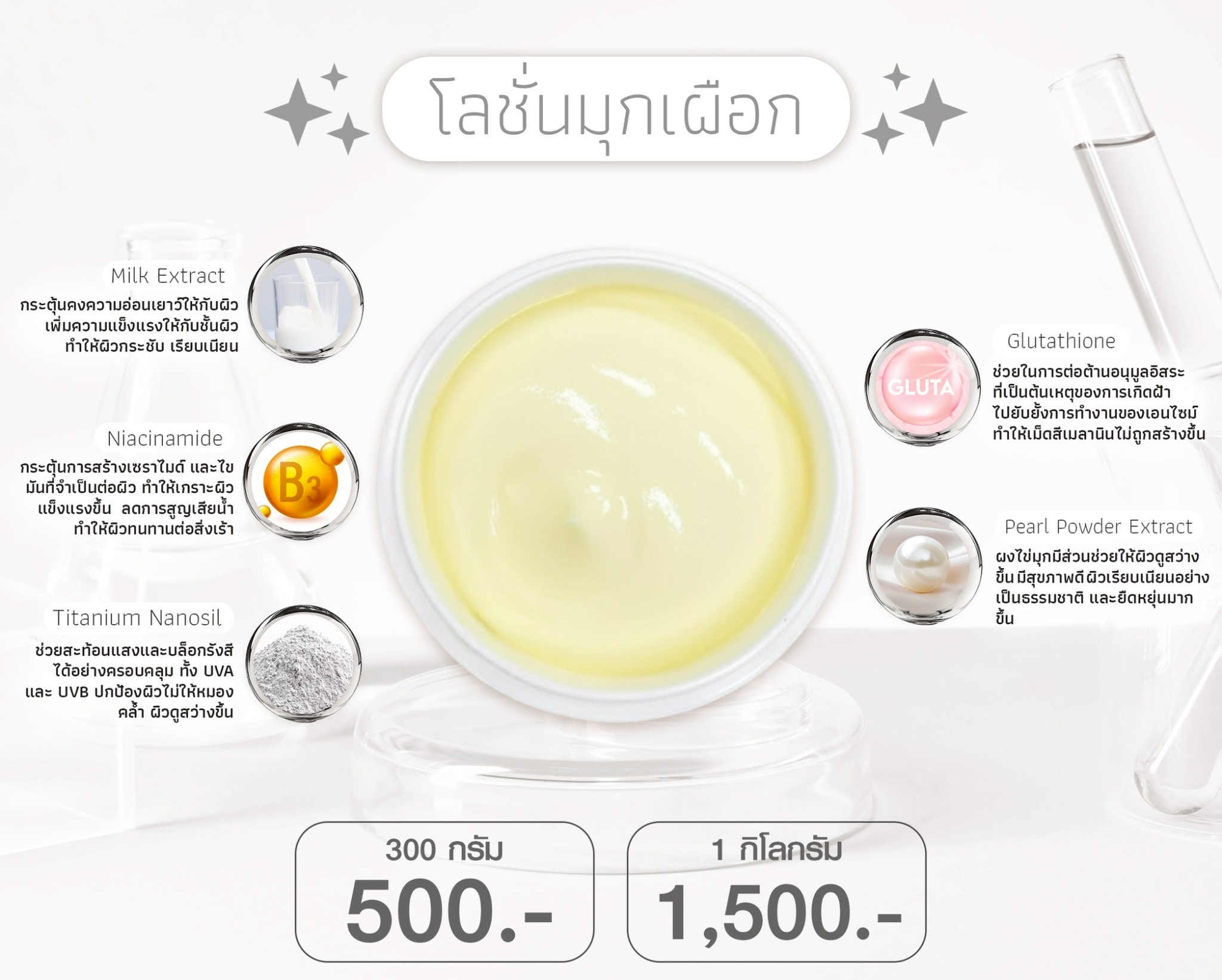 โลชั่นสูตรเข้มข้น เนื้อบางเบา ผสานการบำรุงด้วยกลูต้าไธโอน และผงไข่มุก
