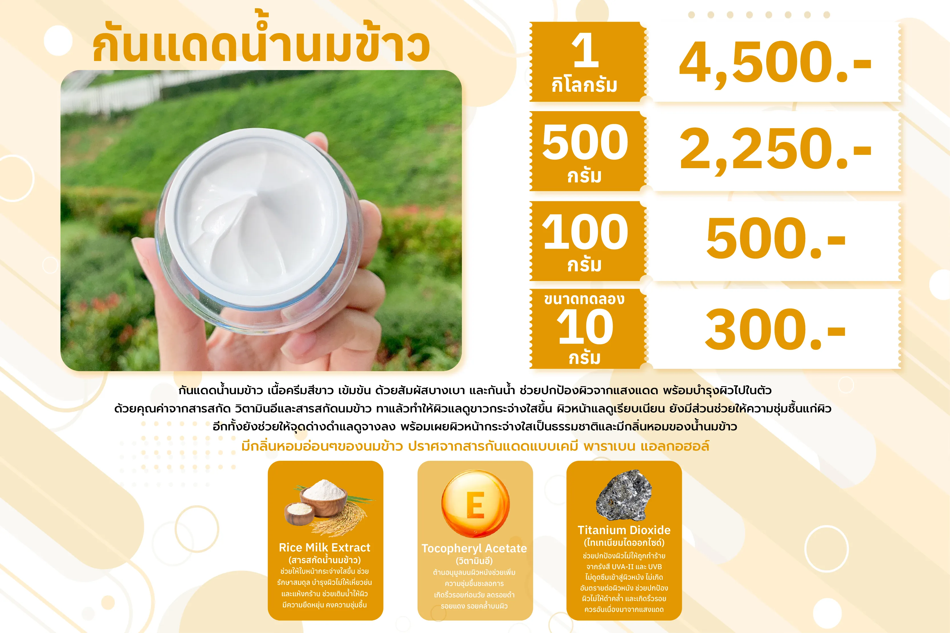 กันแดดน้ำนมข้าว เนื้อครีมสีขาว เข้มข้น สัมผัสบางเบา และกันน้ำ ช่วยปกป้องผิวจากแสงแดด ด้วยค่า SPF 20 PA+++ พร้อมบำรุงผิวไปในตัว